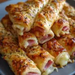 Delightful savory sticks made of flaky puff pastry filled with gooey cheese and rich ham, perfect for appetizers or snacks.