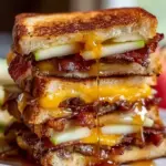 A delightful grilled cheese sandwich featuring sweet hot honey, rich cheddar, savory beef, and crispy bacon, layered with fresh apple slices.
