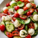 The Juicy Cucumber Caprese Salad invites you to experience the vibrancy of fresh ingredients dancing on your tongue. Its kaleidoscope of tastes, textures, and colors bring sunshine to your plate and joy to your heart. Whether you’re savoring it alone or sharing it with loved ones, each bite is a celebration of life, love, and the beauty of simplicity. So embrace the warmth of this delightful recipe, and let it brighten your table this season. Try it today and savor the magic of summer flavors!