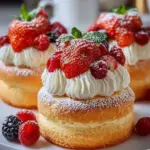Delicate, fluffy cakes that are light as air, topped with whipped cream and fresh berries for a delightful treat.